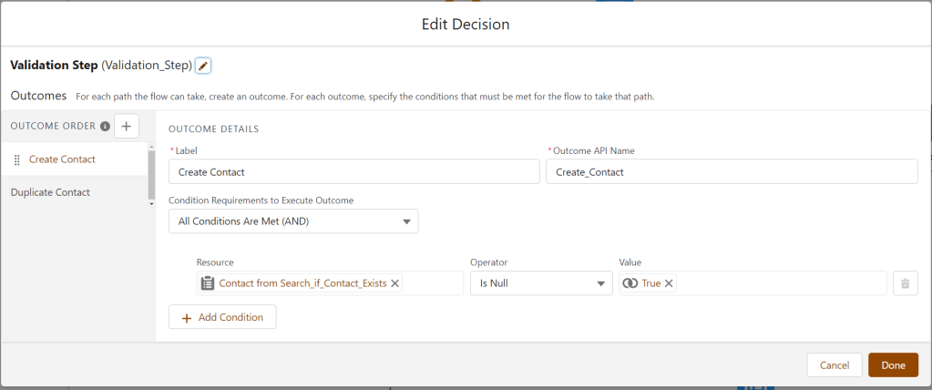 Below, you’ll find the element details that I used in a Flow that creates a Contact with built-in de-dupe screen.