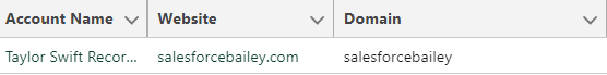 The first field, named ‘Domain’, is a formula field on the account object that will grab just the domain name of the account’s website.