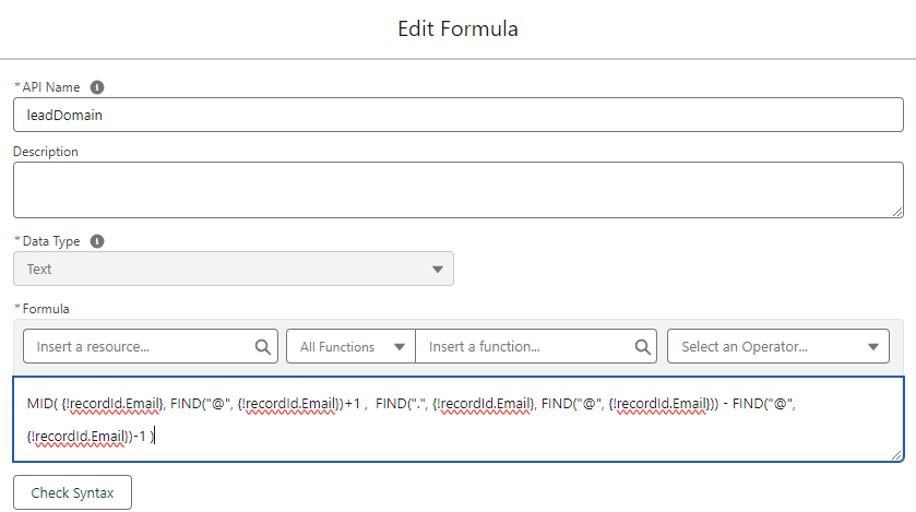 The leadDomain formula grabs just the domain from the email address on the lead to compare it later with the account’s Domain formula field we created earlier.
