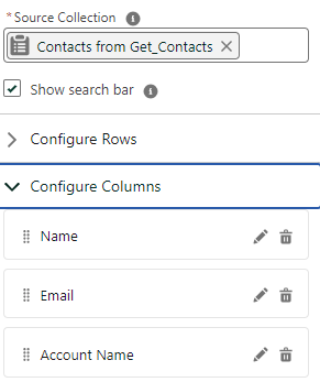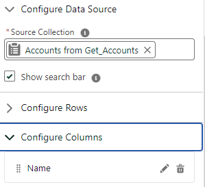 The 2nd table should use the Get Accounts components as the source collection. Just as with the Contact datatable, bring custom Name field that was created to show the account name as a hyperlink.