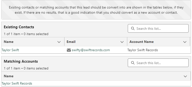 I saw the above example he had written in the notes section of one of his co-worker’s leads. This gave me the idea to make a screen flow to help give a clear visual that would show them existing contacts and matching accounts or if all indications pointed to them needing to create new records instead.
