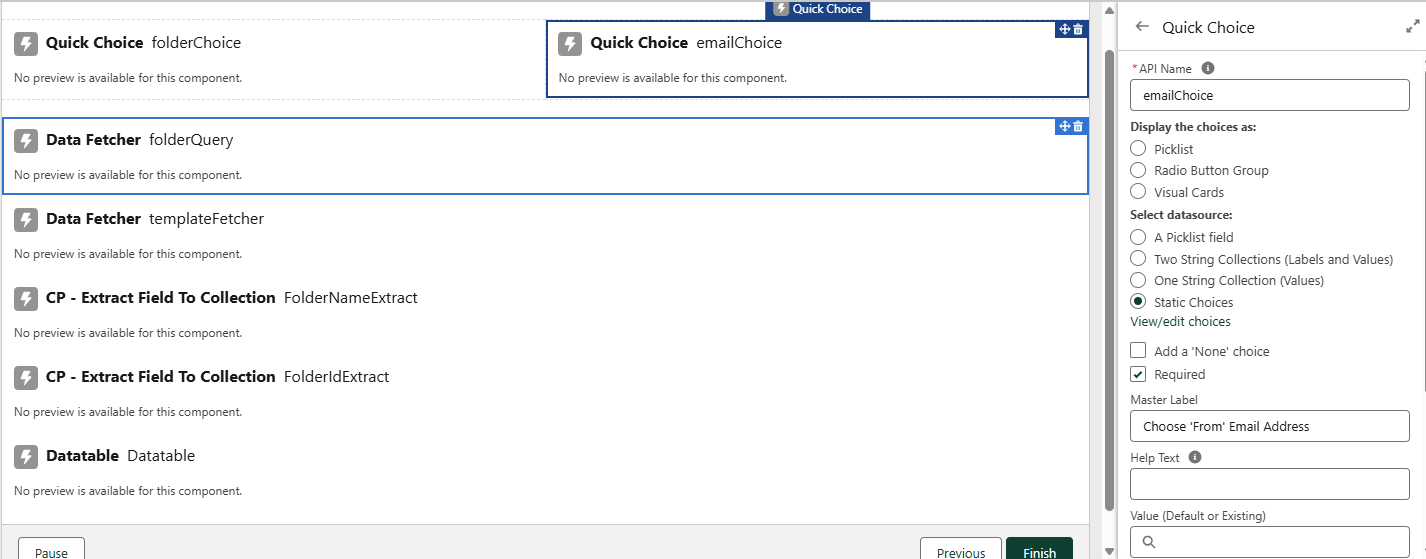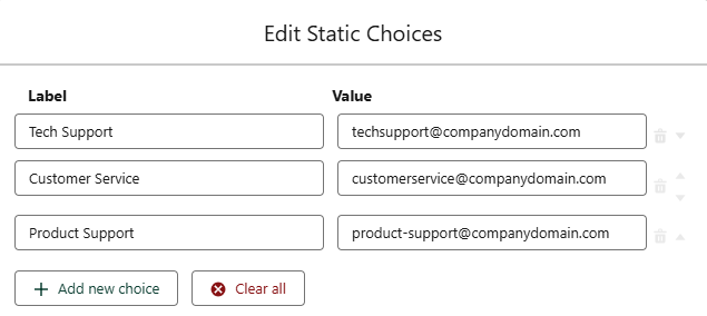 Add your static choices that allow the user to choose the Org Wide Email Address to utilize as the ‘From’ email