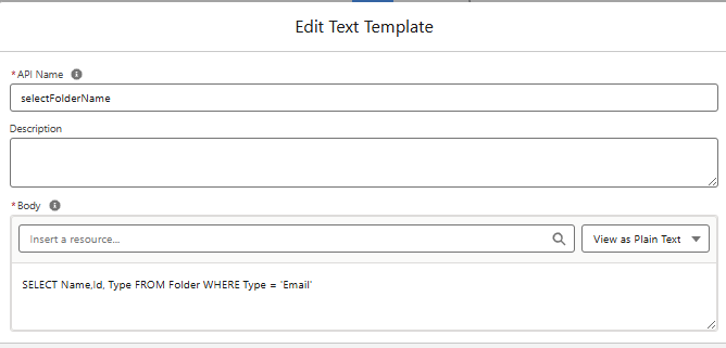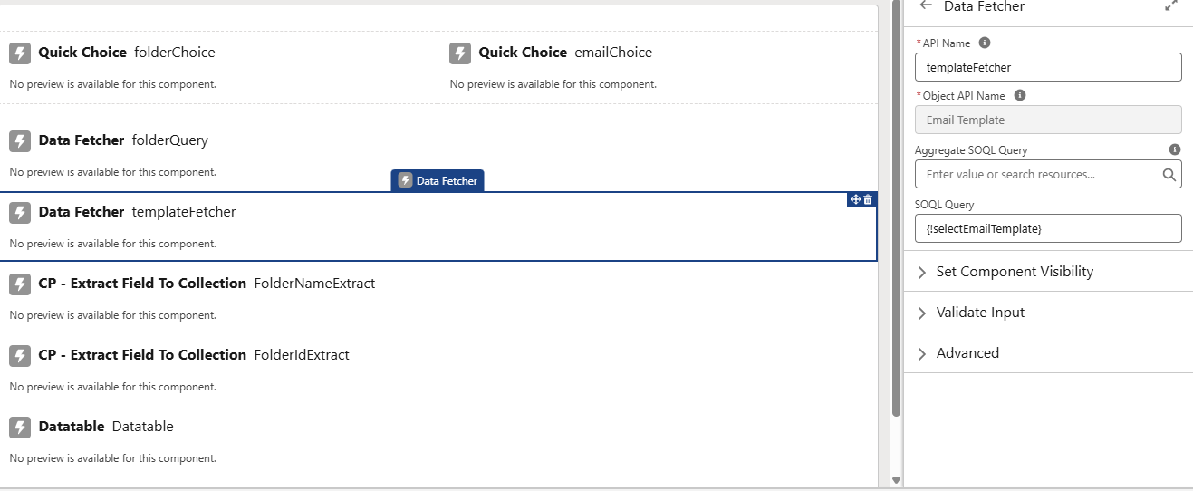 This is the 2nd query for the 2nd Datafetcher we will add on the screen component. It queries all active Email Templates that are in the folder the user chose in the QuickChoice (folderChoice) component we added.